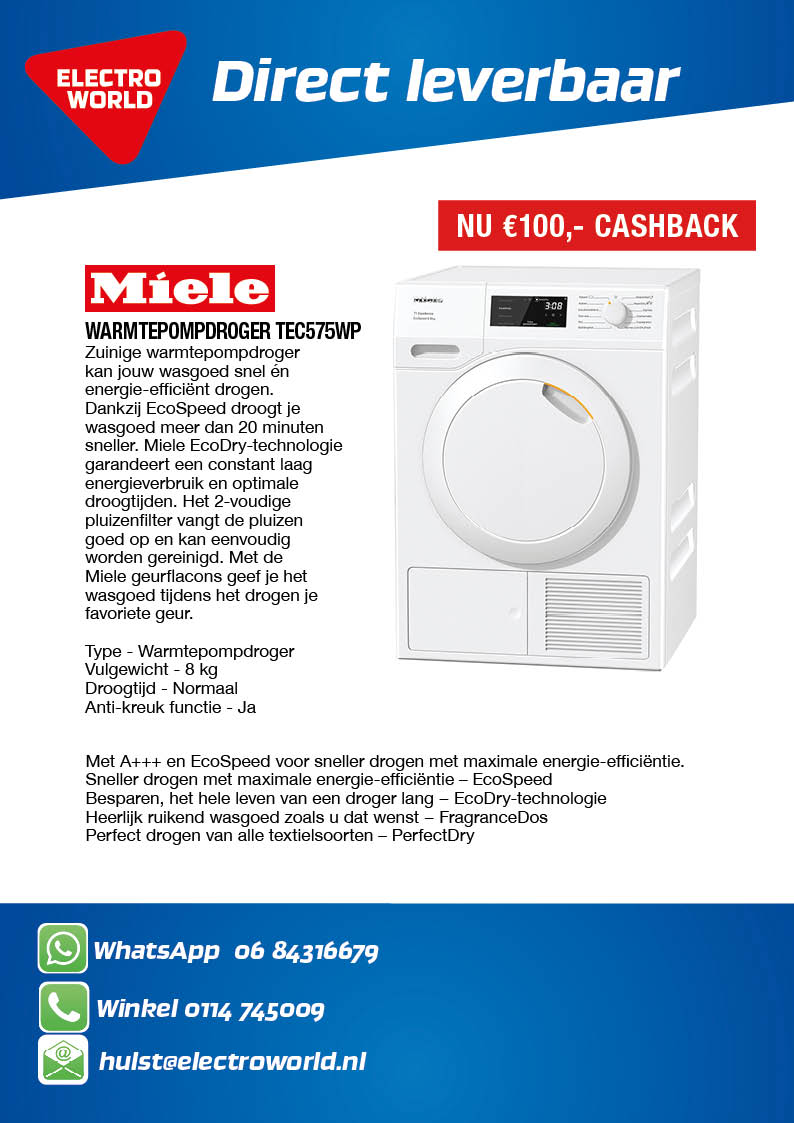 Miele TEC575WP droger 1249,-.
